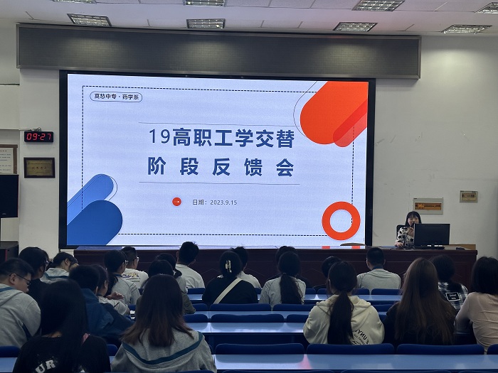 2023年9月15日上午,药学系组织19高职学生开展了第一次工学交替阶段性总结会。药学系费梦莹主任对近期工学交替实践课程进行了阶段性总结,并在本次总结中向学生简单介绍医药行业的分类和发展。