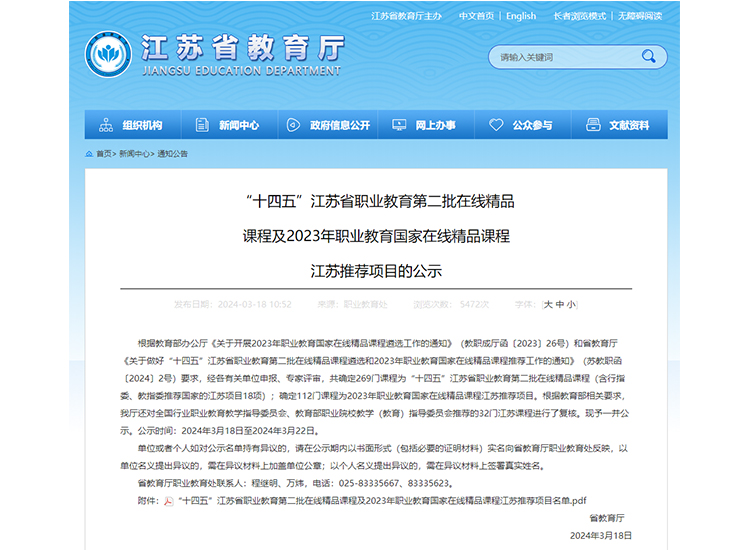 喜报:学校《信息技术》课程被评为江苏省职业教育第二批在线精品课程
