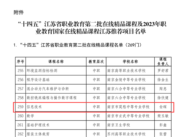 在江苏省教育厅公示的“十四五”江苏省职业教育第二批在线精品课程评选结果中,南京市莫愁中等专业学校申报的《信息技术》课程于2024年3月18日被评为“十四五”江苏省职业教育第二批在线精品课程,实现了学校课程质量建设在省级层面的新跨越。该在线精品课程由信息工程系计算机教研组的俞琛主任牵头,吕芸组长和童音副主任组织申报,团队成员有高博老师、金健老师等,全组老师均给予了大力支持。